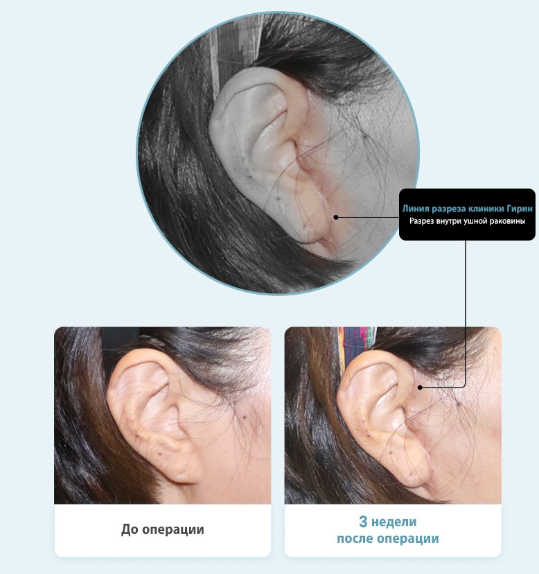 После операции шрамСистема ухода за шрамами в клинике Гирин обеспечивает отсутствие следов после операции, а благодаря разрезам внутри уха шрамы не видны.